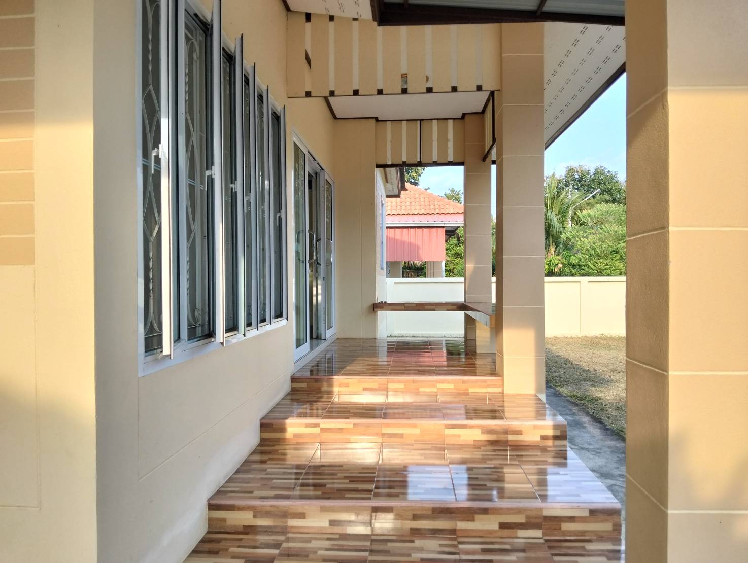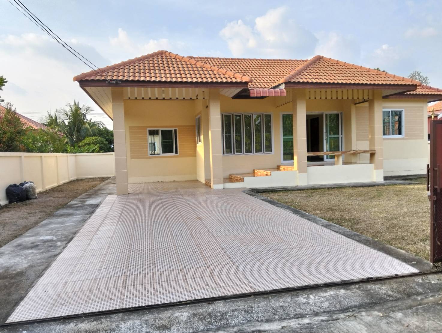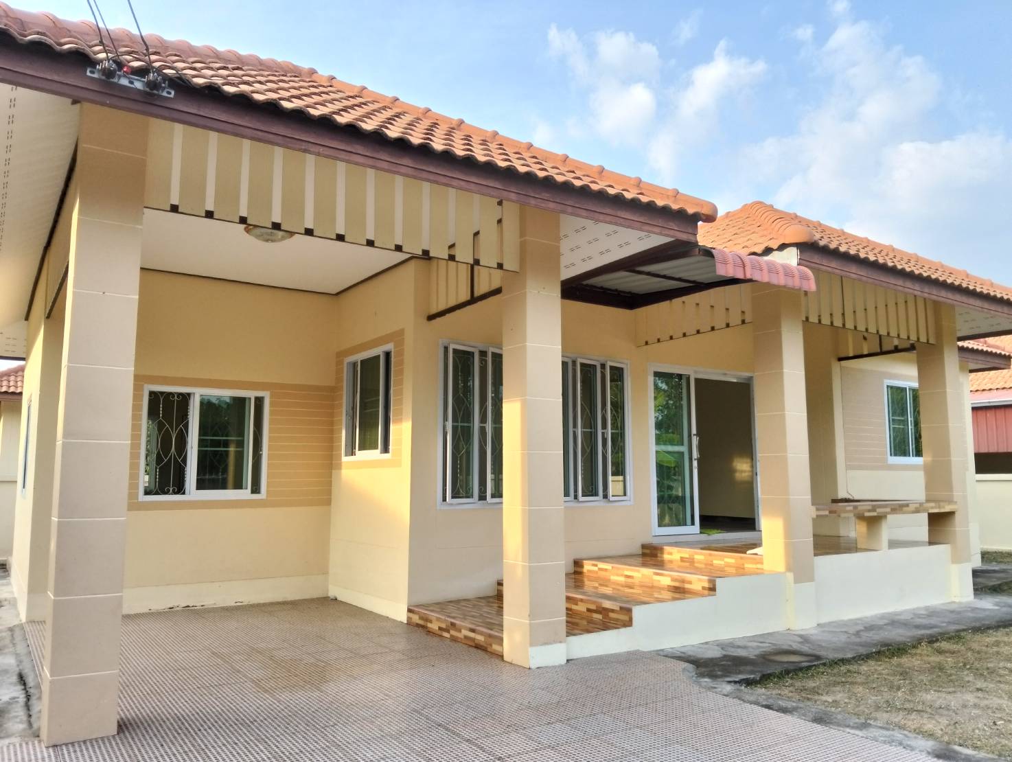 บ้านเดี่ยวชั้นเดียว 3 ห้องนอน, 2 ห้องน้ำ, 1 ห้องโถงกว้าง, 1 ห้องครัว+เคาน์เตอร์ครัว+ซิงค์ล้างจาน, บ้านกว้างขวางอยู่สบาย, มีที่จอดรถยนต์ได้ 2-3 คัน (พื้นที่ 100 ตรว.)